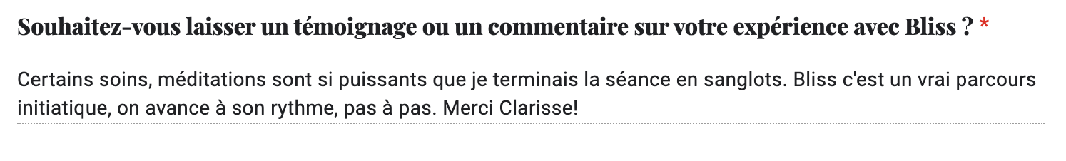 Avec Bliss, notre objectif est de créer un espace chaleureux et accueillant où nos clients peuvent se sentir en paix et en harmonie. Nous nous engageons à offrir une expérience de haute qualité à tous ceux qui font appel à nos services.